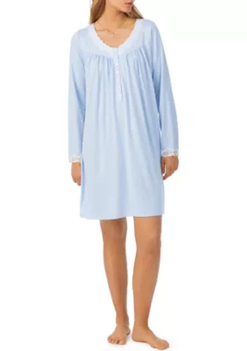 This soft sweater knit short nightgown is a staple for cold weather. Gorgeous 2" embroidered lace trims the V-neckline and sleeve openings. It is finished with stunning shirring details across the front yoke and an Akoya button placket. Button closure V-neck Long sleeves Imported Product Specifications 36" L Material & Care Polyester, spandex Machine washable