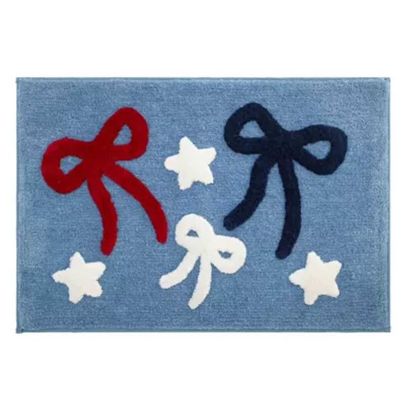 The Avanti Sweet America Decorative Rug features three large bows in red, white and blue with 3 white stars in between on a medium blue ground. The rug is finished with a matching medium blue taped edge. The rug is made of 100% polyester for quick drying, super soft feel and brilliant color. Measures 20" x 30" with a non-skid, latex back. A great way to add a patriotic touch to any bathroom, entryway or kitchen. 1-Piece Novelty Imported Product Specifications 20-in. x 30-in. Material & Care Polyester Machine washable, gentle cycle