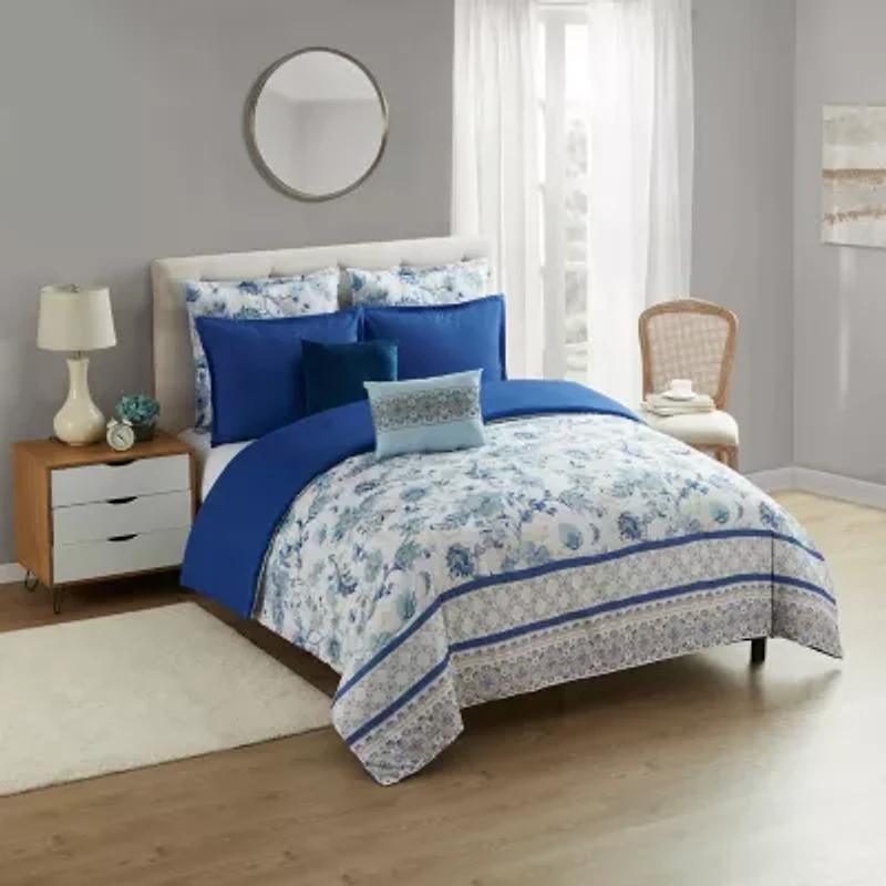 Give your bed a whole new style with this beautiful Margolis floral seven-piece comforter set by sweet home collection. Set is complete with 1 down alternative comforter, 2 pillow shams, 2-euro shams, and 2 accent pillows. The reversible comforter features faded blue floral design with a damask border, reverses to solid royal blue color. Comforter is all season for year-round comfort. 100% hypoallergenic. Complete set is machine washable.