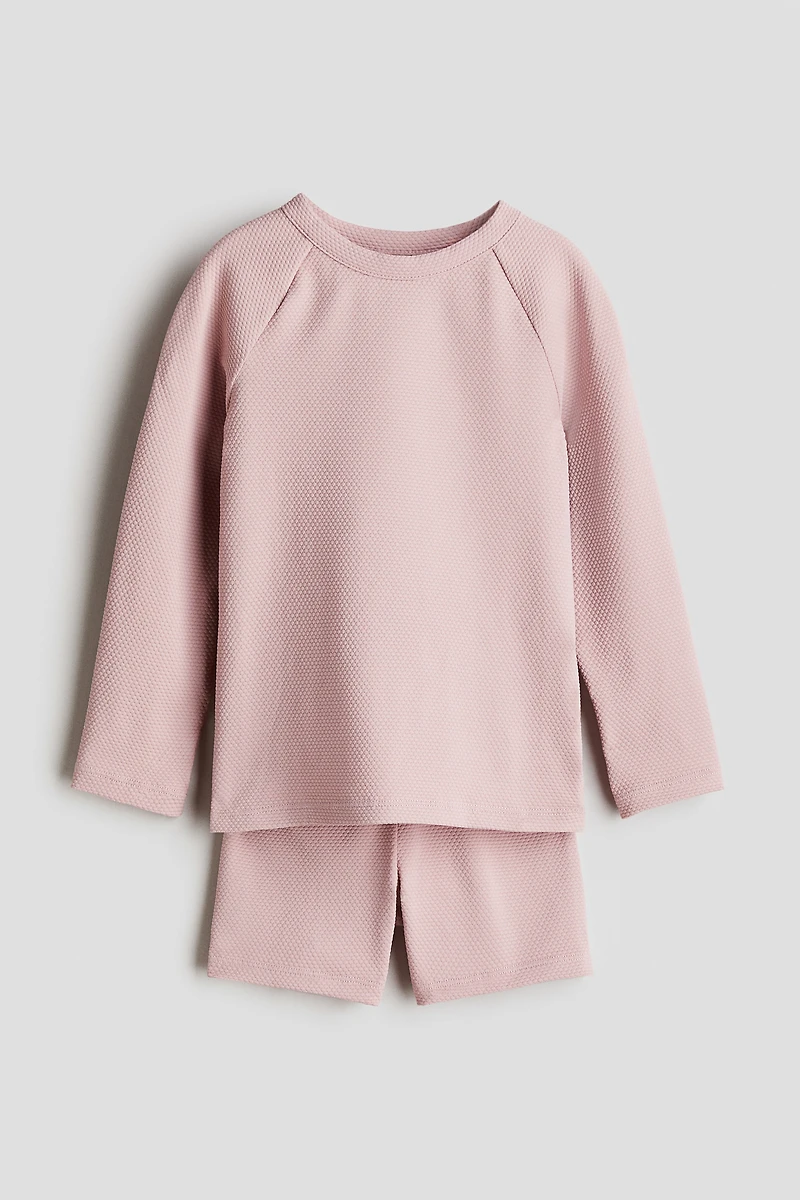 H&M Adorables. Set with a swim shirt and swim shorts in textured, UV-protective fabric. UPF 50. Shirt with a round neck and long raglan sleeves to minimize seam friction. Shorts with an elasticized waistband.