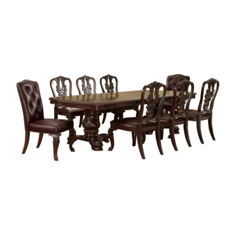 Romance a traditional dining area with this elegant nine-piece wood dining set in brown cherry including a rectangular, extendable double pedestal dining table and six side chairs, all with a gorgeous brown cherry finish. With intricate carvings and an enticing rope design around its apron, this brown cherry finish table coordinates beautifully with chairs showcasing gracefully curved backrests with carving details, leather-like upholstery, and cabriole legs.