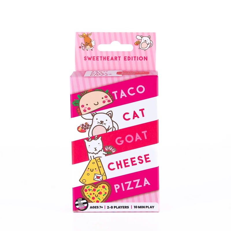 Taco Cat Goat Cheese Pizza Valentine's Day Edition is the perfect gift for your Valentine! The same hand-slapping mayhem from the original game with a festive twist. With three NEW special action characters, this game is sure to become a Valentine's Day favorite. Perfect for ages 7 and up, this fast-paced game is ideal for class parties and celebrations with family or friends! And with a quick, 10-minute play time, you can make lasting memories any time with Taco Cat Goat Cheese Pizza Valentine's Day Edition!Details:For 2 to 8 players10 minute play timeFor ages 7 and up