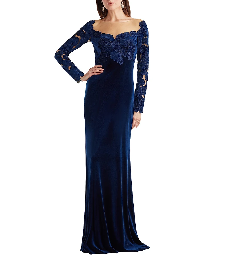 Tadashi Shoji Velvet Embroidered Floral Illusion Long Sleeve Square Neck A-Line Gown