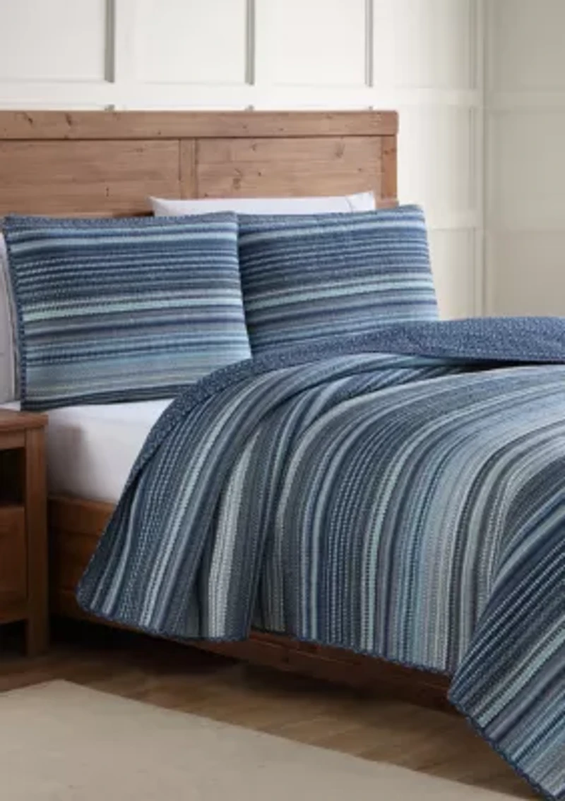 The Taj Quilt Set from Estate adds spice and flare to any room that needs a lift of color. Reversible and soft, this bold set will bring a fashion-forward look to any bedroom. Twin quilt set includes: 1 Quilt 68 in x 86 in 1 Sham 26 in x 20 in Full/ Queen quilt set includes: 1 Quilt 86 in x 86 in 2 Shams 26 in x 20 in King quilt set includes: 1 King quilt 102 in x 86 in 2 Shams 36 in x 20 in Stripe pattern Imported Material & Care Polyester Machine washable