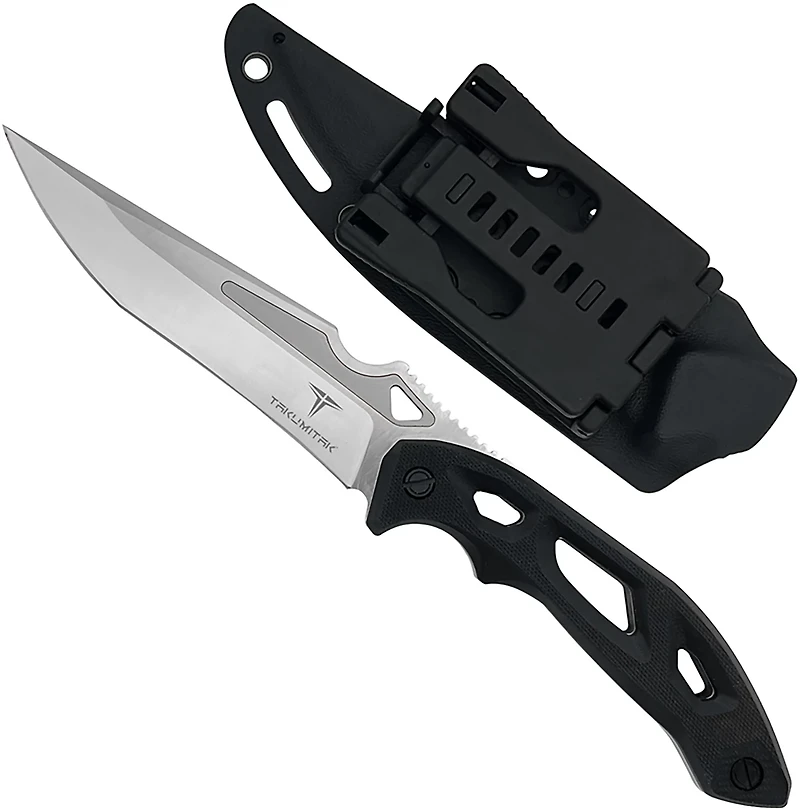 Quickly cut through tough objects with the Takumitak Unhinged D2 Fixed Blade Knife. This durable multipurpose knife has a D2 steel blade with a polished finish that stays sharp. The lightweight G10 handle and full-tang construction add strength while offering a nonslip grip in wet conditions. 7.8 ounces. 5-inch blade. 10-inch total length. Kydex sheath.