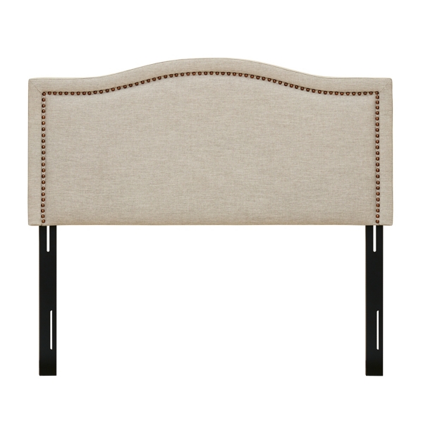 Elevate your bed with the refined look of this Tan Upholstered Augusta King Headboard! This upholstered headboard offers a stylish versatility to complement any bedroom decor. Headboard measures 79.75W x 3.5D x 52.5H to 56.5H in. Crafted with a plywood frame and metal legs Upholstered in tan linen fabric with foam fill Accented with nailhead trim Slight arch shape Black metal legs with adjustable height from 52.5 in. to 56.5 in. Assembly required; tools included Care: Spot clean This item is available at Kirklands.com only, not available in stores. Please note: this item cannot be shipped to APO/FPO addresses.