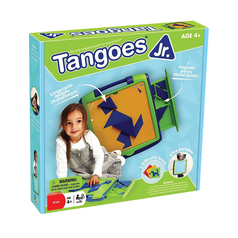 Tangoes Jr. brings the fun, creativity, and problem-solving challenges of Tangoes to a unique toy designed specifically for kids. With a large playing surface, seven magnetic puzzle pieces and recognizable puzzles, children can create countless classic tangram images. All seven puzzle pieces and all 12 puzzle cards store in the unique plastic carrying case. Tangoes Jr. also has an integrated carry handle, making it great for on-the-go fun. Multiple difficulty levels allow for more challenging puzzles as the child gets older.
