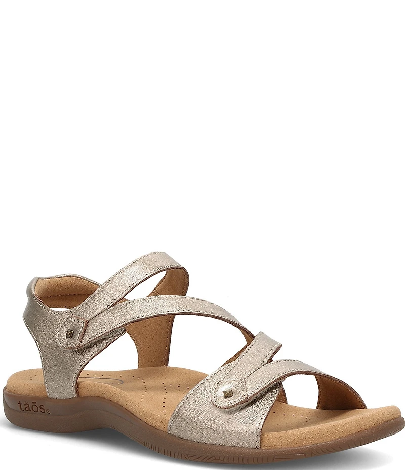 From Taos Footwear, the Big Time Leather Strap Sandals feature: Leather upper Pewter pyramid stud accents Adjustable hook-and-loop straps Synthetic lining Taos Soft Support™ premium micro suede wrapped PU footbed provides arch & metatarsal support Flexible, durable rubber outsole Approx. 0.75" heel height Imported.