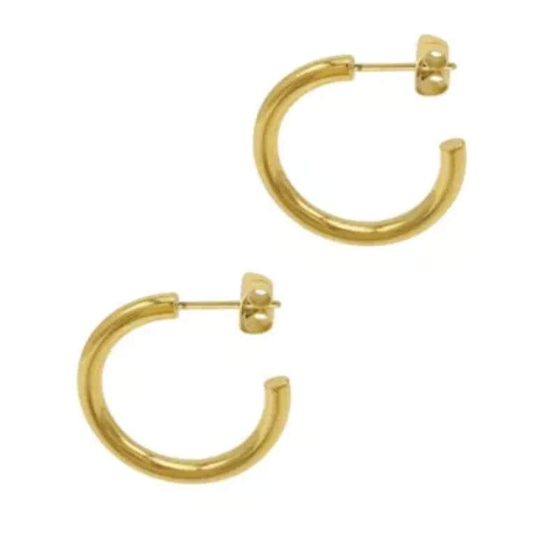Tarnish Resistant 14k Gold Plated Tube Hoops 2 Post back, Jewelry clasp Polished finish Warranty available China Imported Product Specifications 1" diameter, 3mm thick, 1in Material & Care 18k yellow gold plated stainless steel Metal, Stainless steel Clean with a soft cloth.