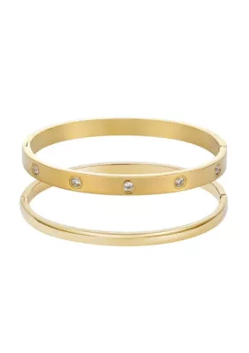 Tarnish Resistant 18k Gold Plated Eternity and Plain Cuff Set 2 Jewelry clasp Polished finish Warranty available China Imported Product Specifications 2.3" diameter Material & Care 18k yellow gold plated stainless steel Metal, Stainless steel Clean with a soft cloth.