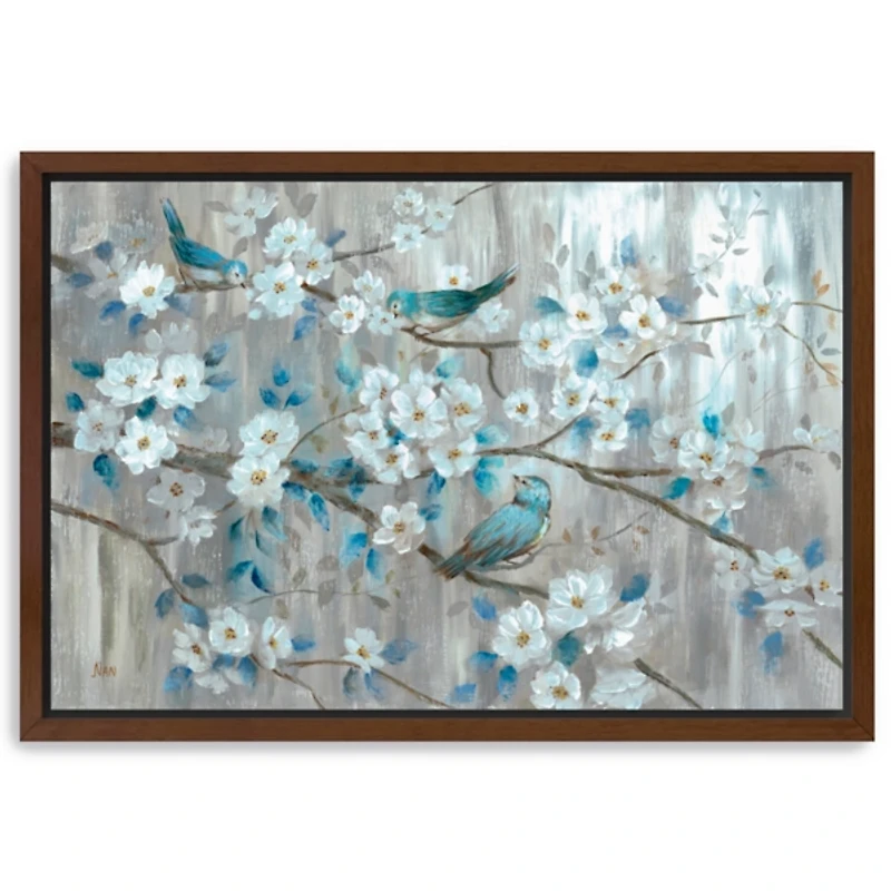 Let the ethereal beauty of nature awaken your space with this Teal Birds Framed Canvas Art Print. Blooming flowers and teal blue birds against a muted background evoke a serene feeling. Overall dimensions Width: 48 in. Depth: 1.75 in. Height: 32 in. Distinctively printed on stretched canvas Walnut finish frame around wrapped canvas Birds on flower tree subject Hues of teal, gray, brown, and white Artist: Nan Weight: 13 lbs. Hangs from back-mounted hardware Care: Dust with a soft, dry cloth. This item is available at Kirklands.com only, not available in stores. Please note: this item cannot be shipped to APO/FPO addresses.