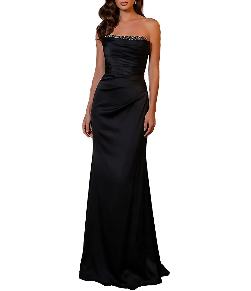 From Terani Couture, this dress features: Satin fabrication Sheath column gown silhouette Strapless neckline Sleeveless Beaded detail Lined Zip back closure Approx. 62" length Polyester Dry clean Imported.