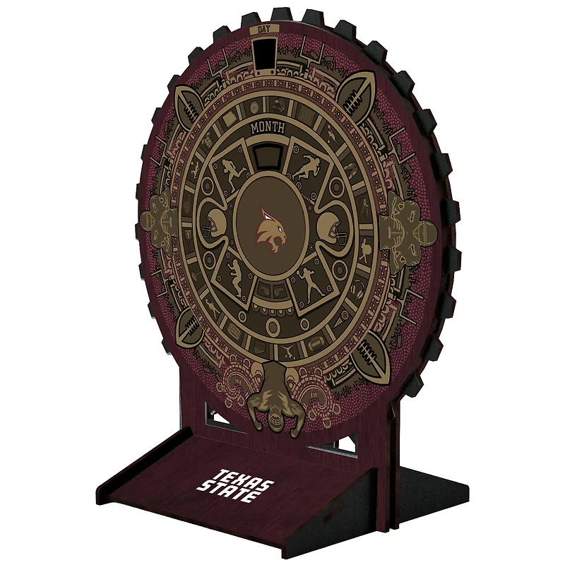 Spruce up your home or office with this unique Texas State Bobcats Aztec Circle Desk Calendar. This calendar can be dialed to the proper month and date, and includes Texas State Bobcats colors and graphics, ensuring everyone knows where your allegiance lies year round.