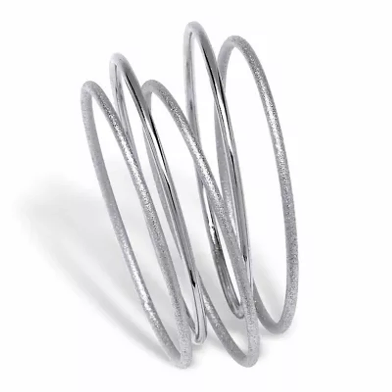 Dress your wrist in our set of five fabulous bangles for a classic fashion upgrade to your favorite outfits. Lightly textured or polished smooth, they add instant style to your look. 9" length. Silvertone.SilvertoneMeasures: 14.5 mm wide x 9 inches long x 3.5 mm highIncludes gift box and drawstring pouchSilvertoneDimensions: 14.5 mm wide x 9 inches long x 3.5 mm highIncludes gift box and drawstring pouch 5 No clasp Polished finish Warranty available China Imported Product Specifications 0.71 in x 9 in x 0.57 in, 9" length Material & Care Metal, Silver-tone metal Clean with a soft cloth.
