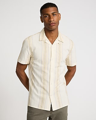 A timeless short sleeve button-down shirt complete with a camp collar and an embroidered vertical striped print.
