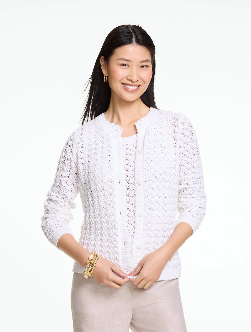Our timeless crewneck cardigan is beautifully crafted in an airy open stitch texture. Crafted from a soft cotton blend. A polished addition to your wardrobe this season.
