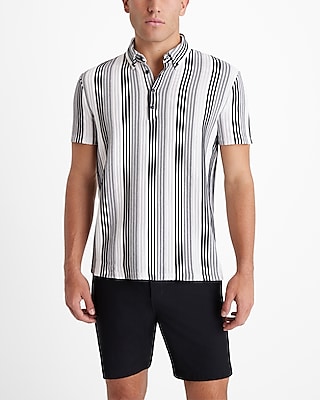 This cotton-blend polo features a textured stripe print, a button-down collar, a four button placket and short sleeves.