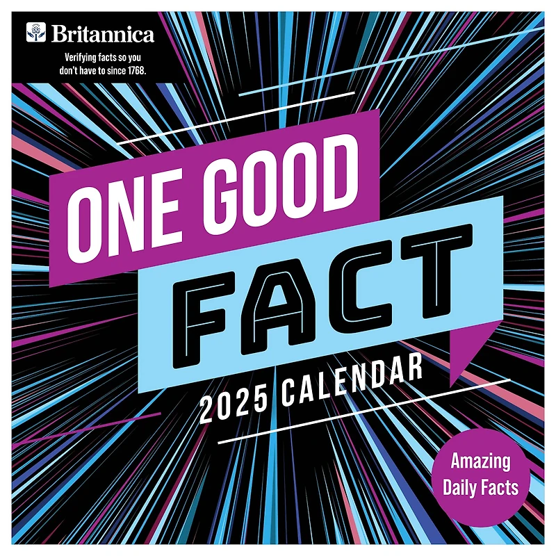 Learn something new every day with our One Good Fact calendar from trusted historians, Britannica! This 2025 12-month wall calendar measures 12" x 12" (12" x 24" open) and includes a historical fact every day with monthly calendar grids and a bonus spread featuring a 4-month view of January 2026 - April 2026.