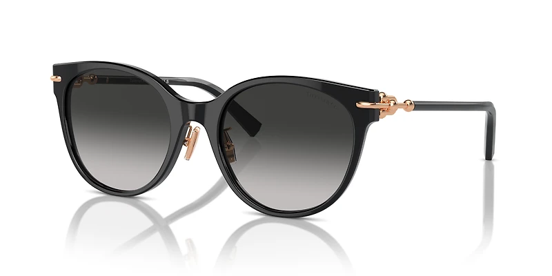 Elevate your look with these Tiffany & Co. TF4223D cat-eye sunglasses. Crafted with a black acetate frame, they exude timeless sophistication. The sunglasses' low bridge fit enhances comfort, while the gradient grey lenses add a touch of elegance. Finished with the distinctive HardWear gauge link detail at the hinge, these full-rim frames channel unmistakable Tiffany charm.
