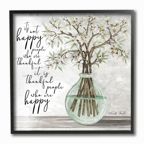 Remind yourself of the importance of gratitude with this Thankful People who are Happy Framed Art Print. This piece is perfect for any room in your home. Framed print measures 12L x 1.5W x 12H in. Frame crafted of wood Black frame finish Features vase of flowers Text reads "It's not happy people who are thankful it is thankful people who are happy" in black Mounted on board Hues of white, gray, black, brown, and green Weight: 2 lbs. Hangs from back-mounted hardware Care: Dust with a soft, dry cloth. This item is available at Kirklands.com only, not available in stores. Please note: this item cannot be shipped to APO/FPO addresses.