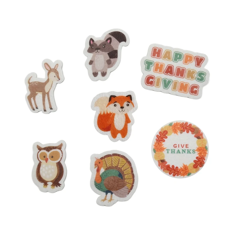 Craft for the fall season with your little one with these felt stickers from Creatology! Featuring a fawn, owl, fox, raccoon, turkey, "Happy Thanksgiving", and a "Give Thanks" wreath, this set of stickers will add an adorable woodland and fall touch to your papercraft projects.Details:Multicolor5.5" x 8" (14cm x 20.3cm) package size85 piecesPolyester, paper, and glueFor ages 3 and up