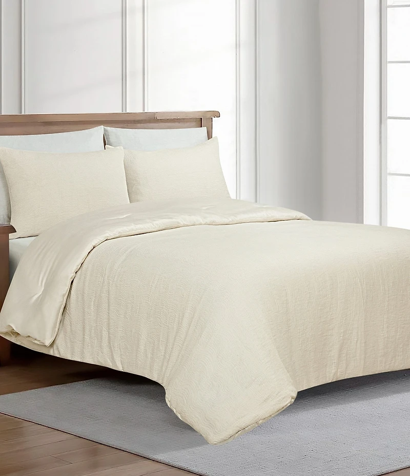 From The Art of Home from Ann Gish, this comforter mini set features:  Jacquard interspersed with silver threading elevates this soothing texture Fabric Face and Reverse: Tencel, cotton  viscose, and polyester blend 200 GSM poly fiberfill for comforter  Set includes: a comforter and two coordinating shams Machine washable, tumble dry Queen comforter mini set includes: Queen comforter approx. 96" x 96"  Two standard sham approx.  20" x 26"  King comforter mini set includes: King comforter approx. 108" x 96"  Two king sham approx. 20" x 36"  Imported.