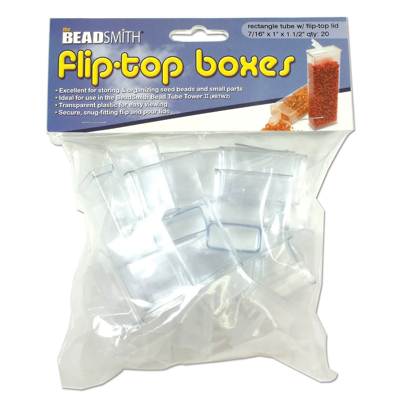 These flip top boxes are great for storing small findings or seed beads.Details:Clear0.4375" x 1" x 1.25" box size20 boxesPlastic