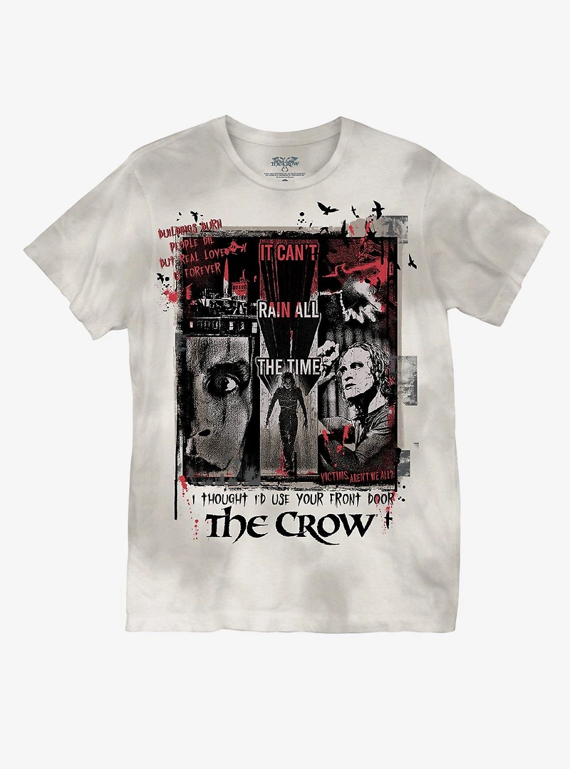 Your closet could use another horror tee! This one from The Crow has an acid wash and features a stylized collage of Eric Draven and quotes from the film. Please note: Wash pattern may vary. Please note: Style runs large; size down for a tighter fit.