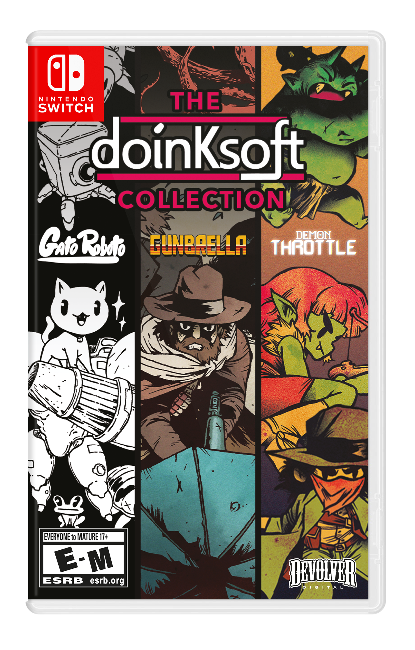 Doinksoft is a Devolver Digital studio based in Portland, Oregon (United States), and the creators of Gunbrella, Gato Roboto, and Demon Throttle! All three Doinksoft games are now available in one Nintendo Switch multi-cartridge! Gunbrella Gunbrella is a gritty noir-punk action-adventure set in a world dependent on a rapidly diminishing natural resource. Fill the rain-soaked boots of a gruff woodsman on a quest for revenge, entering an unfamiliar town armed only with the titular Gunbrella, a high-caliber firearm that doubles as an umbrella. Your hard-nosed investigation soon becomes entangled with the inner workings of a creepy cabal of ghouls and gangsters, cops and cultists, and the fallout of corporate exploitation. Gato Roboto Pounce inside of your cozy armored mech and set off on a dangerous trek through an alien underworld full of irritable creatures and treacherous obstacles in a valiant effort to save your stranded captain and his crashed spaceship. Tiptoe outside the friendly confines of your technological marvel and follow your feline instincts through tight tunnels and mysterious waterways to scavenge for new weapons and gear. Adventure awaits the most curious of cats in Gato Roboto! Demon Throttle Demon Throttle tells the story of a beautiful vampiress and dusty gunslinger on a quest for vengeance against a demon that stole her mystical chalices and slept with his estranged wife. Now the two unlikely companions must blast their way through four monstrous generals and their wicked domains to lift the demon's curse and exact their revenge.