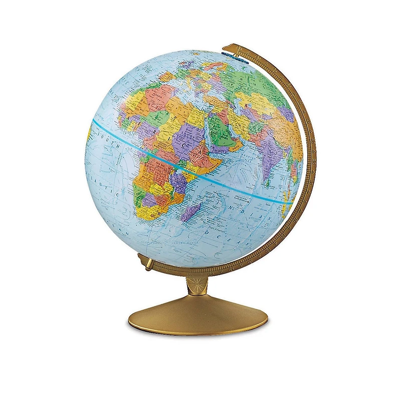 The Explorer Classroom Globe contains more than 4,000 place names and distinctive political boundary markings. The striking colors invite students of any age to explore and learn about the world. Details: 12"Includes metal gold-colored baseWood, metal