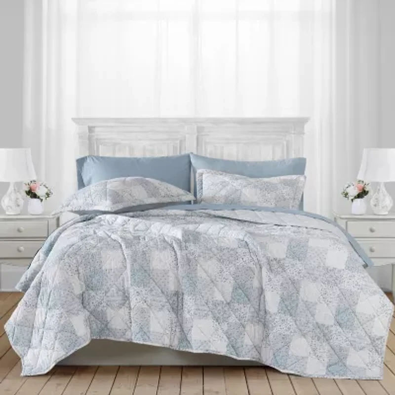 Bring timeless beauty and gentle charm to your bedroom with The Farmhouse by Rachel Ashwell Bohemian Rhapsody Quilt Set. Inspired by Rachel Ashwell's signature style, this quilt set blends rustic simplicity with romantic floral elegance, creating the perfect balance of comfort and design. The vintage-inspired blue floral pattern evokes cottage garden charm and complements both traditional and farmhouse settings with ease. Woven from crisp 200 thread count 100% cotton percale, the quilt's breathable fabric feels cool and comfortable against the skin. It's lightly filled with 100% polyester for a lightweight bedspread feel-ideal for layering during cooler months or using on its own during warmer seasons. Whether you're refreshing a guest room or updating your master bedroom, this farmhouse floral quilt brings soft sophistication and cozy comfort into any space. Designed to suit a variety of bed sizes, the Bohemian Rhapsody Quilt Set is available in Twin, Full/Queen, and King options. Each set includes coordinating floral shams with envelope-style closures to complete the look. The entire set is OEKO-TEX Standard 100 Certified, ensuring that every piece is made without harmful substances and is safe for you and your family. This cottagecore bedding favorite is also machine washable, making it a practical and stylish addition to your home. Available in a serene blue colorway, this Blue color Quilt Set in Full/Queen size (and other sizes) transforms your bedroom into a relaxing retreat with layered textures, delicate patterns, and shabby chic bedding appeal. Whether your style leans vintage, bohemian, or farmhouse, this quilt set adds just the right amount of detail and softness to complete your bedding ensemble. Available Sizes and Dimensions: Twin Quilt Set includes 1ne quilt: 68" W x 86" L, and one standard sham: 20" W x 26" L; Full/Queen Quilt Set includes one quilt: 90" W x 94" L with two standard shams: 20" W x 26" L; King Quilt Set includes one quilt: 108" W x 94" L, two king shams: 20" W x 36" L.