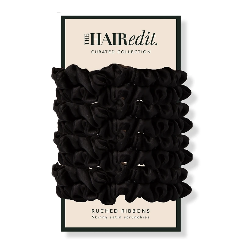 BLACK RUCHED RIBBON 8 PACK. Features: Slim profile complements your ponytail, bun, braid or half-up. Ultra-soft and smooth texture makes them so comfortable you can sleep in them. Comes in a pack of 8 black slim satin scrunchies. Works for all hair types. : :