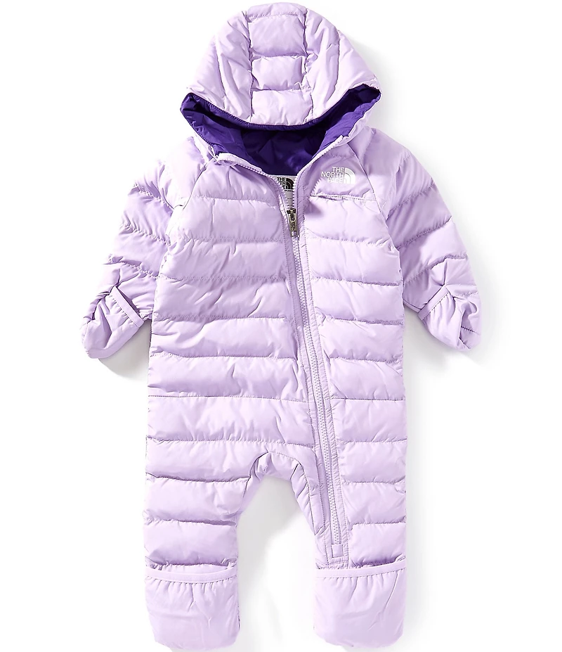 From The North Face, this One-piece features: Attached, three-piece hood Exposed, asymmetrical, VISLON center front zip with a chin guard Long sleeves Pacifier pocket on left chest Fold-over mitts at sleeve cuffs and booties at bottom hem Elastic binding on sleeve cuffs and bottom hem ID label Heat transfer logo on left chest and back-right shoulder his one-piece features a non-PFC durable water-repellent finish so it s always ready for a new adventure Non-PFC DWR finish for added water repellency Body fabric and lining made with recycled polyester Recycled synthetic-cluster insulation helps keep you warm even when wet Machine wash/tumble dry Imported.