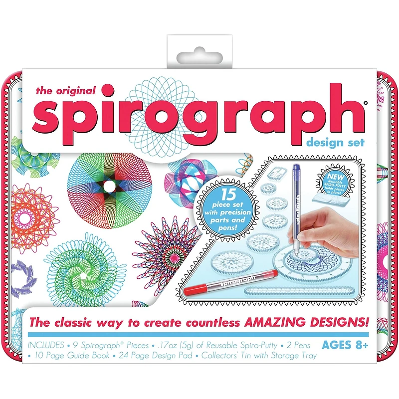 A 15 piece set with precision parts and pens! The classic way to create countless amazing designs. This package contains seven spirograph precision wheels, one spirograph precision ring, one spirograph precision rack, reusable spiro-putty, two retractable ball point pens, ten page guide book, one 24-page design pad and one collectible travel tin with snap-in storage tray.Details:15 piecesConforms to ASTM D-4236For ages 8 and upContents:9 Spirograph pieces2 pens1 pack of reusable Spiro-Putty1 guide book1 design pad1 collectors tin with storage tray