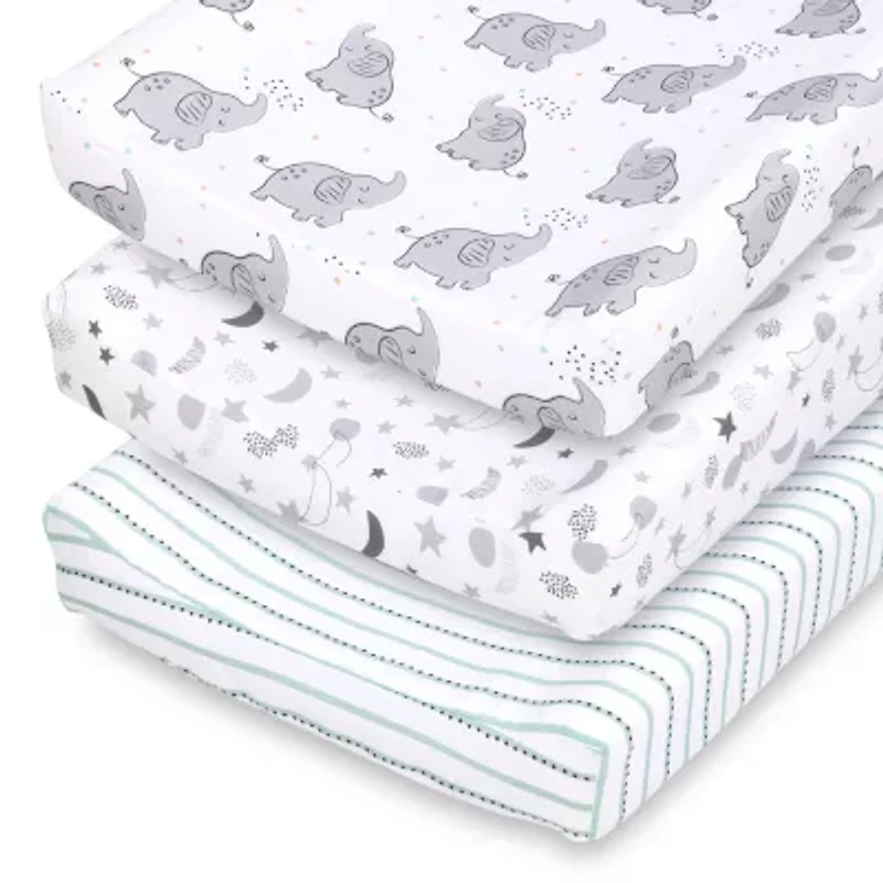 The celestial elephant 3-pack changing pad covers by the peanutshell bring a delightful touch to your nursery. Soft and gentle fabrics are crafted with utmost care for comfortable fuss-free diaper changes. Playfully drawn elephants in shades of gray with pops of primary pastels are complemented by celestial details and dotted green stripe patterns. Elasticized edges guarantee a secure fit on most standard-sized changing pads. Mix and match the covers to create an effortless look!