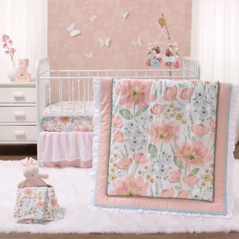 Create a warm and inviting nursery with our 4-piece wildflower bedding set from the peanutshell. This beautiful collection includes a quilt with ruffled border, a bedskirt, and two 100% organic cotton fitted sheets. Pastel shades of pink, green and blue petals create a calming and soothing atmosphere. The intricate floral designs on the quilt and organic cotton sheets add a touch of elegance and feminine flair to the room. Our tiered pink ruffled bedskirt beautifully complements the quilt. Made with high-quality organic materials (exclusive of decoration), this bedding set is not only stylish but also durable and easy to clean.