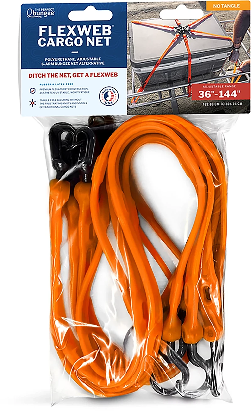 Haul gear on your ATV, SUV and more with The Perfect Bungee FlexWeb Adjustable Bungee Cargo Net. Built-in UV resistance helps prevent fading, while fuel and chemical resistance affords durability. The all weather protection defends against the elements, and when fully expanded, the cargo net covers a surface area up to 144 inches x 144 inches.