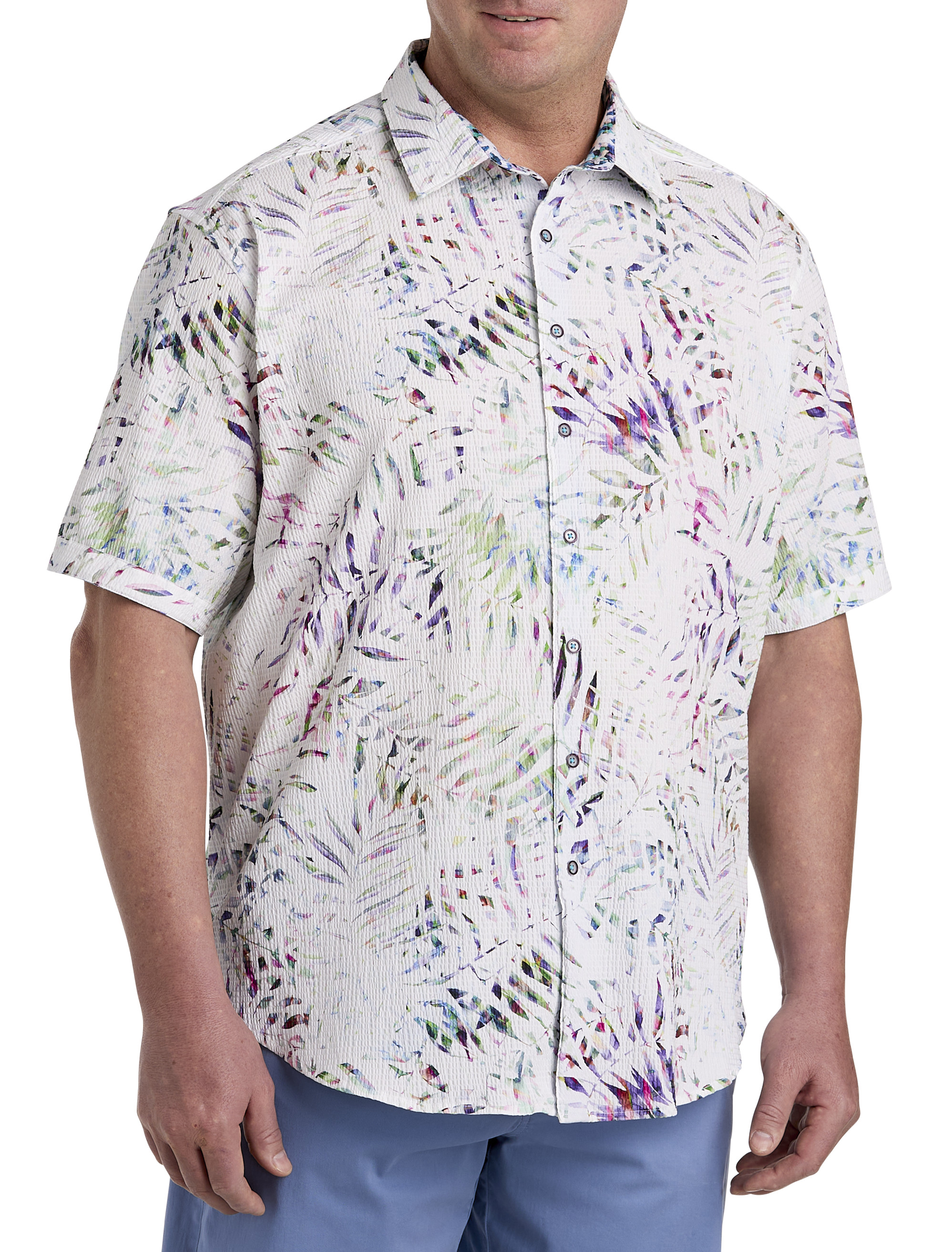 Shades of an Indian summer surface on the allover leaf pattern of this Robert Graham sport shirt. Crafted in cotton seersucker fabric with a touch of stretch for ease, it's the perfect choice to pair with shorts or twills for a polished, yet still casual, look. Check out the contrasting pattern at the collar, too!