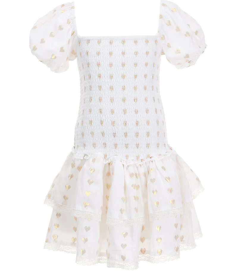 Theme NYC Big Girls Lexi Gold Dotted Cap Sleeve Satin Smocked Bodice Ruffle Tiered Dress in Chattanooga, TN