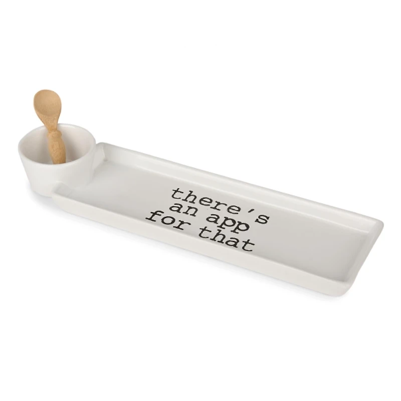 Showcase your quirky side while dining and entertaining with our Theres an App for That Serving Platter. The 2-section design includes a convenient bowl and spoon. Plus, it makes a great gift for a host! Platter measures 15.4L x 4.3W x 2H in. Crafted of ceramic Features the text "There's an app for that" 2-section design Includes wooden spoon Food and microwave safe Care: Dishwasher safe. Contact your local Kirkland's store for availability. Quantities and selection may vary by location.