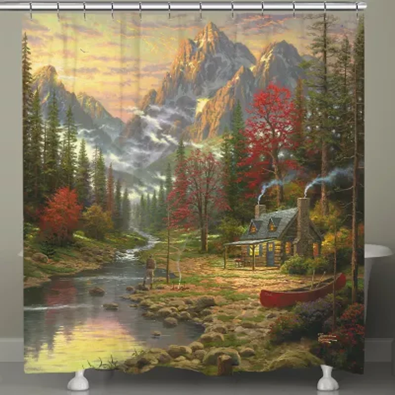 The good life shower curtain features the third and final piece in Thomas Kinkade's beginning of a perfect evening collection. The good life artwork depicts a fisherman who lives in a profound harmony with nature and receives its gifts with humble gratitude, while the towering peaks embrace the valley.