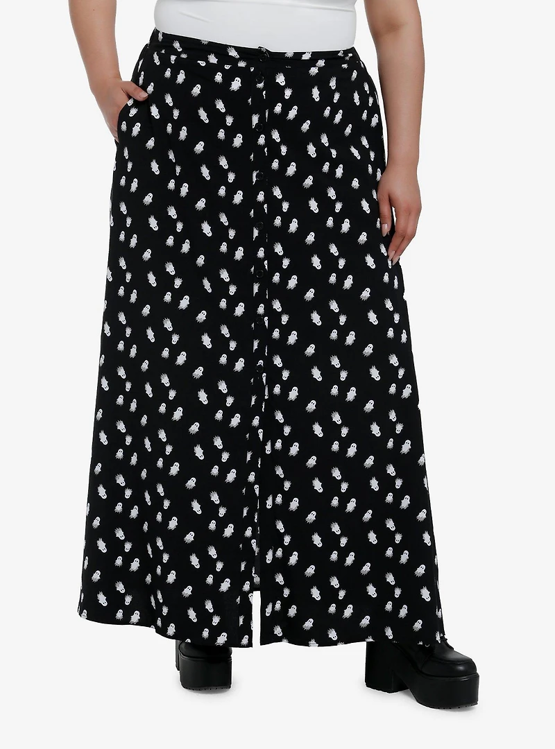 Get ready for a hauntingly fun day or a spirited night out in this black maxi skirt! Featuring an allover ghost print and functional front buttons. Comes with side seam pockets and a half elasticated waistband.