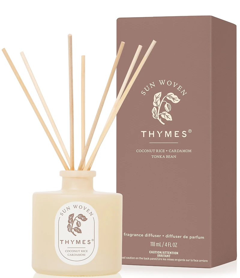 From the Hours Edit™ collection by Thymes, this diffuser features: The Sun Woven Petite Reed Diffuser releases a continual fragrance that is cozy, refined, and indulgent without being overly heavy. The blend of coconut rice, cardamom, and tonka bean is a perfect addition to any sunlit room or midday gathering space. Offering an average of 60-90 days of fragrance Warm/Spicy fragrance Sun Woven notes: Top: Coconut Rice Middle : Cardamom Bottom: Tonka Bean Approximate burn time: up to 55 hours Approx. 4 fl. ounces How to Use Reed Diffusers for Home: Place scent diffuser with sticks on a stable surface that is not wood, lacquered, polished, or painted. Pour reed diffuser oil refill into the diffuser vase. Slender rattan reeds absorb the aroma diffuser oils scents releasing a fresh fragrance throughout your home. Simply flip diffuser reeds to renew the fragrance. Control fragrance intensity by number of reeds used in the scented oil and frequency of flipping the reeds. Made in the USA.