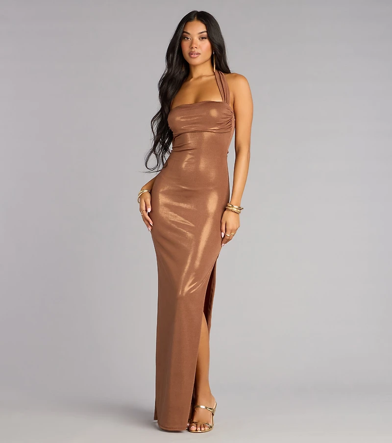 Turn every entrance into a statement with the Tiana formal dress. Crafted from slinky foil fabric that catches the light with every move, this floor-length gown features a sleek square halter neckline and a daring high slit—made to contour, shimmer, and captivate all at once.