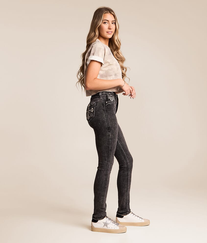 High rise Curvy fit, eased through the hip and thigh 10" bottom opening Rhinestones and sequins on metallic embroidered faux flap back pockets