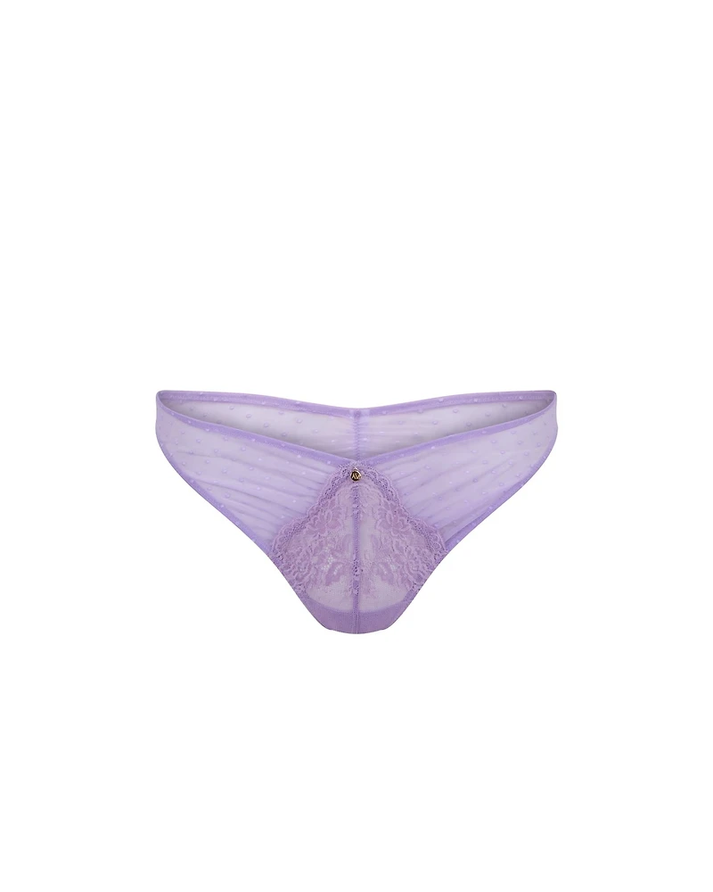 The Tibby Brazilian Medium Purple sheer-fabric Brazilian is a romantic and alluring piece for your top drawer. This style features Style: Brazilian Panty for a flirty twist. (Available in sizes XS-XL.)