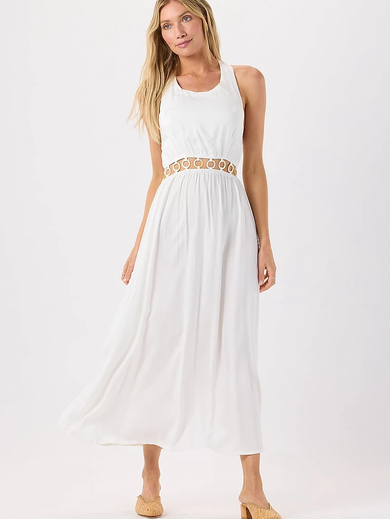 A row of hand-carved shell rings connects the top to the skirt of this chic Maxi style. Features halter neck ties for an effortless, summery feel.