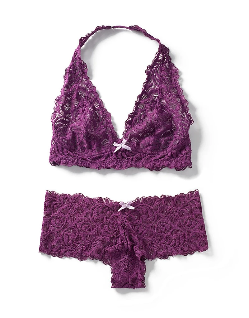 Halt what you’re doing and check out our halter bralette! Verbena in stunning violet is our latest bralette silhouette featuring super soft stretch lace, mesh lined cups, and back hook and eye closure. Perfect for wearing under halters, loose tops to show it off, or just lounging around. We think this will be a new wardrobe staple. Choose from a comfy hipster or cute bikini- both with the perfect amount of cheek.