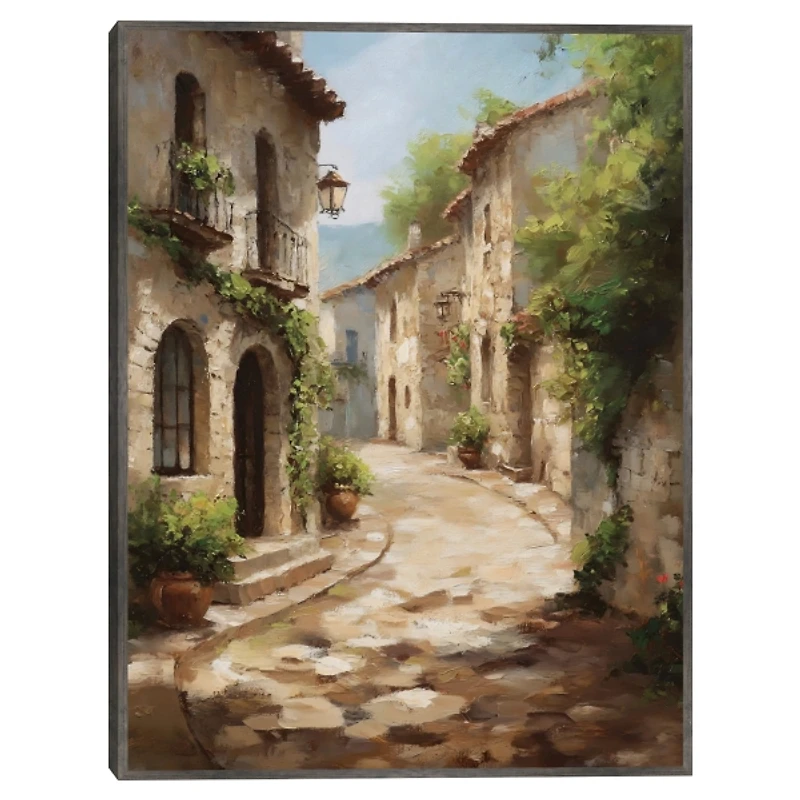Cobblestone paths curve around ivy covered stone walls in this Timeless Village Framed Canvas Art Print. It brings the quiet beauty of a quaint European town to any space! Overall dimensions Width: 31 in. Depth: 1.5 in. Height: 41 in. Printed on stretched, polycotton blend canvas Dark gray frame around wrapped canvas Features a village street Hues of tan, green, blue, and brown Weight: 11 lbs. Hangs from back-mounted hardware; sawtooth hangers included Care: Dust with a soft, dry cloth. Avoid direct sunlight and heat sources. This item is available at Kirklands.com only, not available in stores. Please note: this item cannot be shipped to APO/FPO addresses.