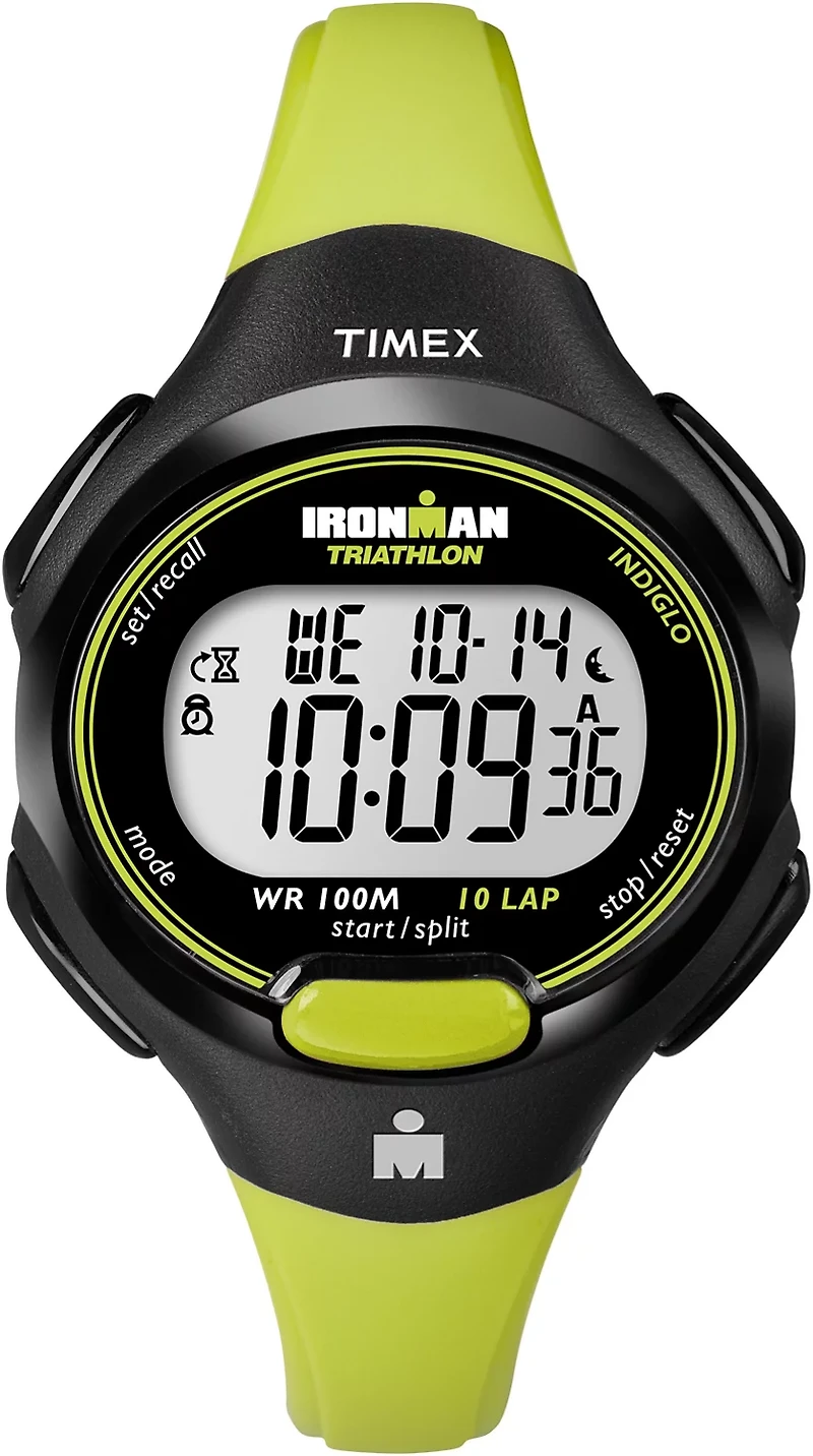 Keep a record of your progress by strapping on the Timex Adults' Ironman 10-Lap Running Watch, which features a 24-hour countdown timer with a stop/repeat component, a 10-lap memory recall and a 100-hour chronograph. The backlit digital display shows you the time, day and date, and the INDIGLO® night-light enables a clear view in low-light conditions. 100 m water resistance.